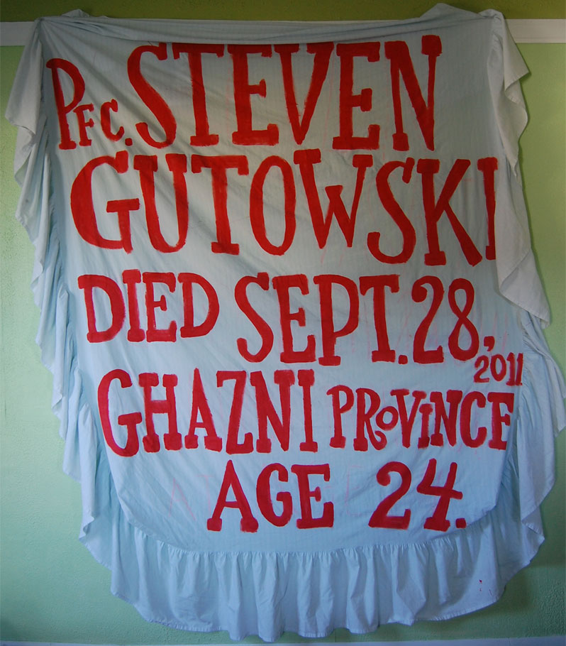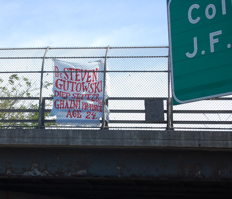 Greg Cook Banner for Specialist Steven Gutowski, 24, who died Sept. 28, 2011, in Ghazni Province. Displayed at Boston Street at Route 93 southbound, Boston. Photo from Oct. 6, 2011.