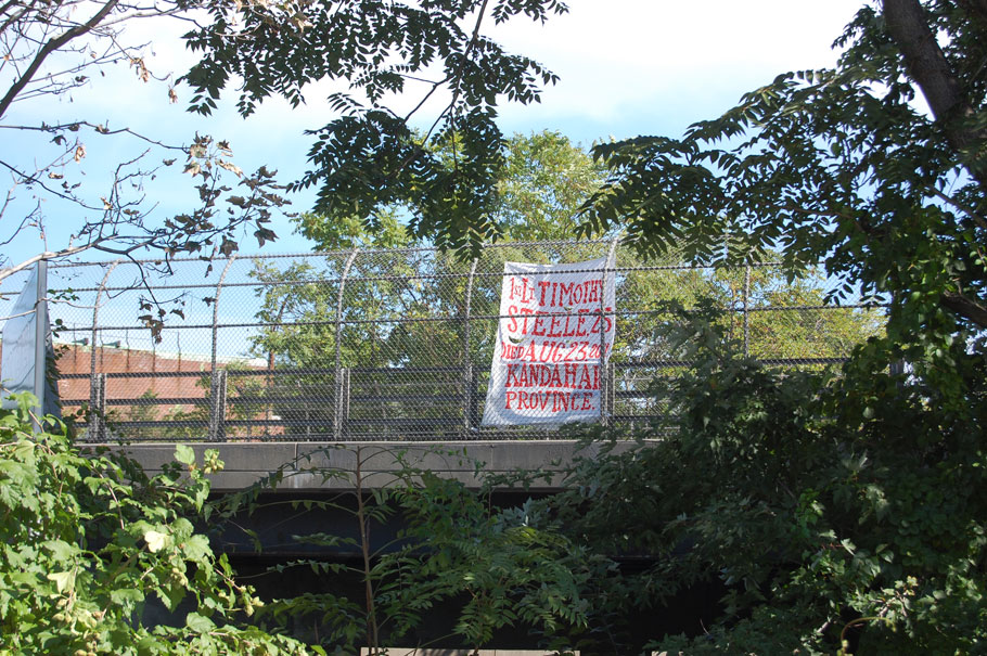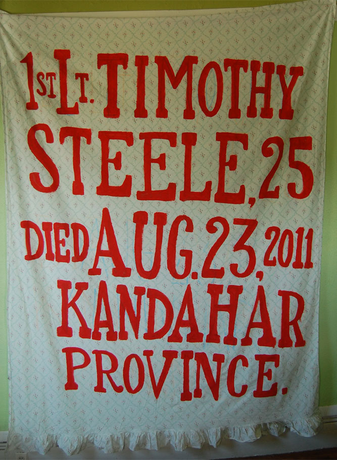 Below: Greg Cook's banner for 1st Lt. Timothy Steele, 25, who died Aug. 23, 2011, in Kandahar Province. Displayed at Dorchester Avenue at Route 93 southbound, Boston. Photo from Oct. 6, 2011.