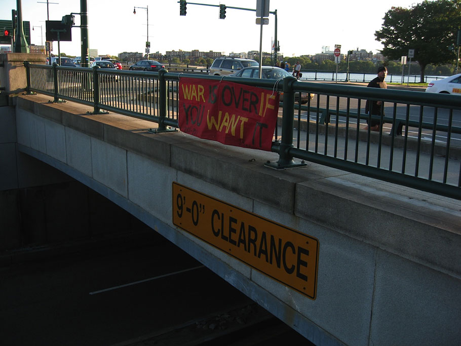 Jill Slosburg-Ackerman and Marilyn Pappas "War is over if you want it" banner (text from John Lennon) displayed on the MIT bridge at Masschusetts Avenue over Memorial Drive, Cambridge. Photographed on Oct. 6, 2011.