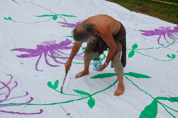 Peter Schumann painting leaves and stems on columbine banners outside the New Barn.