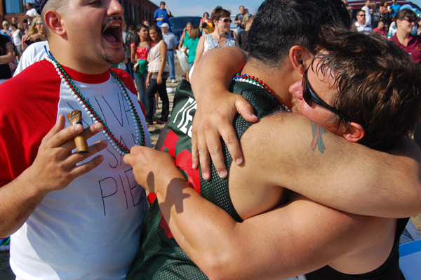 Nine-time Greasy Pole winner Peter "Black" Frontiero (center) and Scott "Squiggy" Lane hug at Pavillion Beach before the Geasy Pole contest.