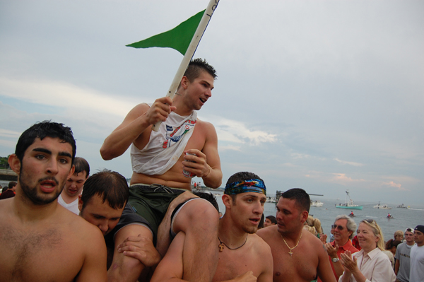 Friday Greasy Pole contest winner Jason Favaloro is carried through the crowd on Pavillion Beach.