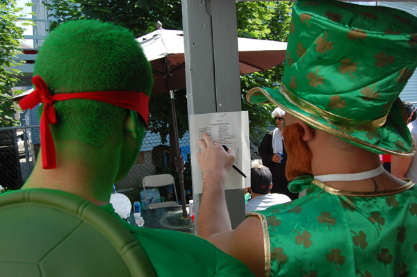 Friday 2006 Greasy Pole contest winner Danny Balbo Jr. (left) and a leprechaun check out the lineup for Saturday's Greasy Pole contest during a party for walkers before the event at Peter "Black" Frontiero's Pine Street home.