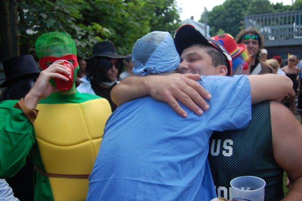 Peter "Black" Frontiero (right) hugs a walker during a party before Saturday's Greasy Pole contest at his Pine Street home. Danny Balbo Jr. is at left.
