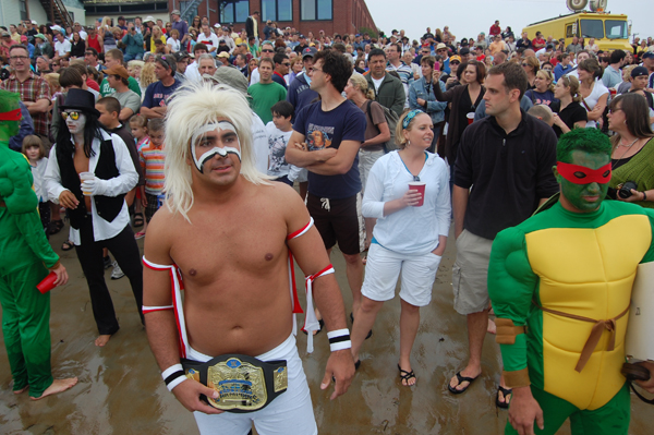 Greasy Pole walkers, including at right Friday 2003 winner Steve Militello, wait on Pavillion Beach for a lift to the platform for Saturday's contest.