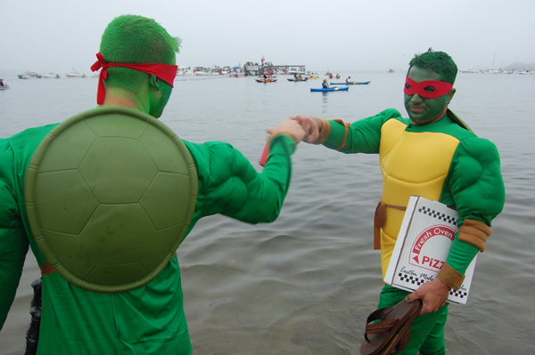 Friday 2006 Greasy Pole winner Danny Balbo Jr. punches fists with Friday 2003 winner Steve Militello as they wait on Pavillion Beach before Saturday's contest.