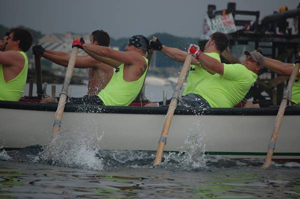 The "Relentless" crew rows past the Greasy Pole platform during Saturday's men's junior seine boat race.