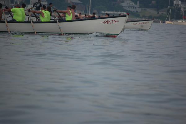 The crew of "Relentless" in the Pinta trails slightly behind the crew of "Do Oar Die" in the Santa Maria during the outbound leg of Saturday's men's junior seine boat race.