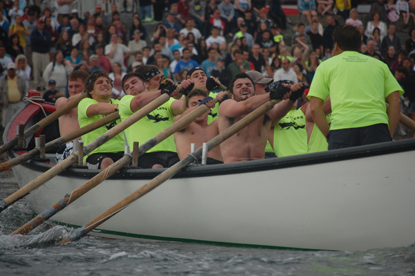 The "Relentless" crew charges toward Pavillion Beach, and a victory, during Saturday's extremely close men's junior seine boat race.