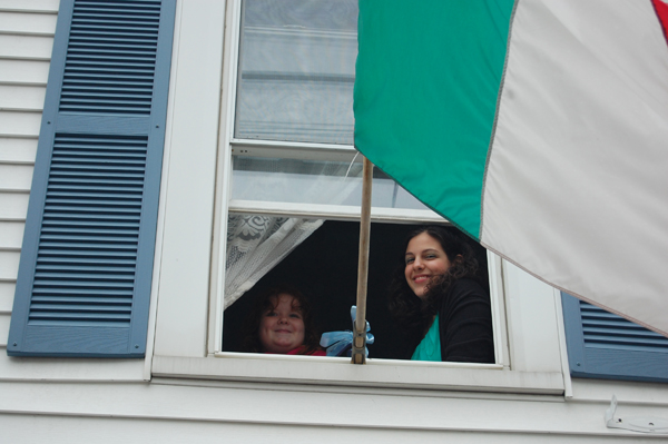 Young women watch the Fiesta procession from a window of the Mother of Grace Club on Washington Street.