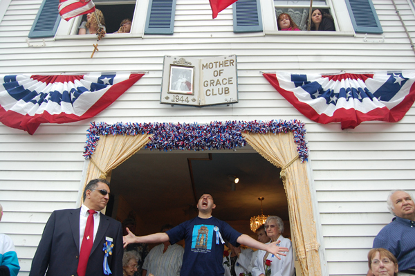 Emilio Oliva shouts blessings in the doorway of the Mother of Grace Club during the Fiesta procession.