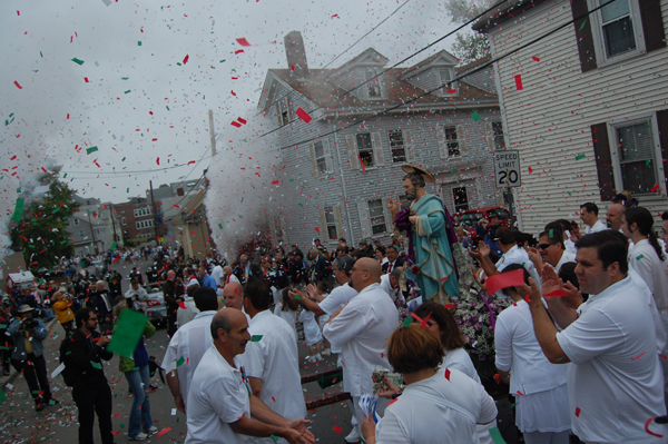 Confetti showers the men carrying the St. Peter statue on Prospect Street during the Fiesta procession.