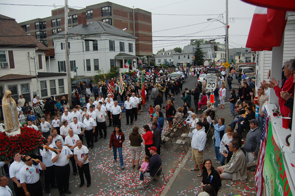 Big Noni and friends clap as the statue of Our Lady of Fatima is carried past her Prospect Street porch during the Fiesta procession.