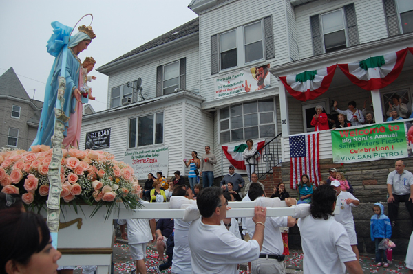 The Mother of Grace statue is carried past Big Noni's Prospect Street home during the Fiesta procession.