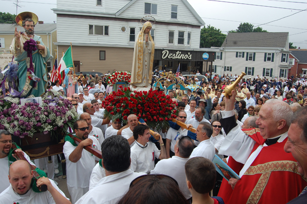 Father Eugene Alves sprinkles the crowd with holy water outside Our Lady of Good Voyage Church on Prospect Street during the Fiesta procession.