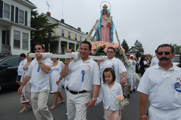 Men carry the Mother of Grace statue down Main Street during the Fiesta procession.