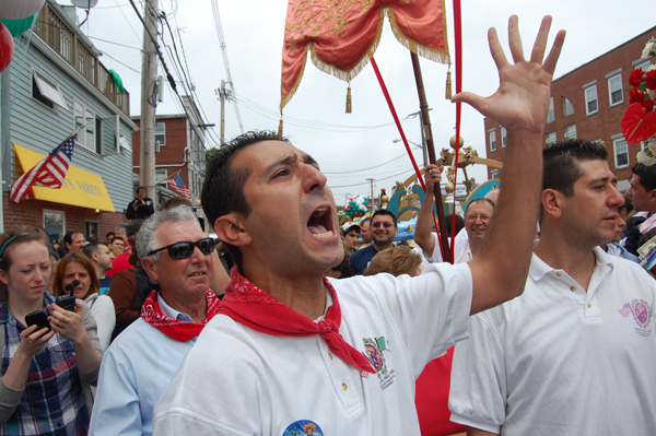 A man shouts blessings outside the St. Peter's Club on Rogers Street at the end of the Fiesta procession.