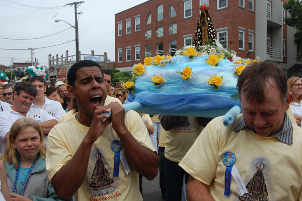 One of the men carrying the statue of Our Lady of Aparecida, representing Gloucester's Brazilian Catholic community, shouts blessings outside the St. Peter's Club on Rogers Street at the end of the Fiesta procession.