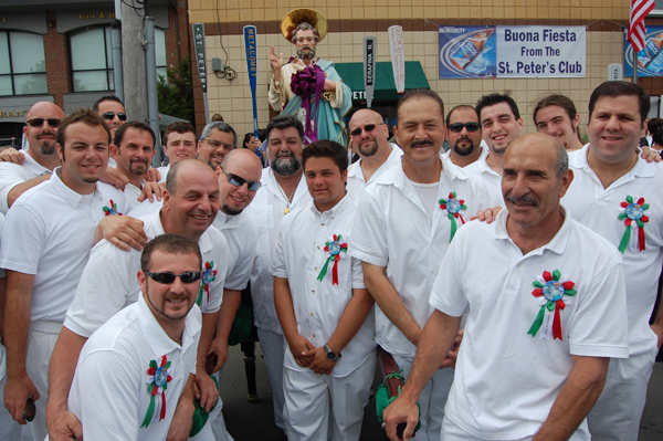 The carriers of the St. Peter statue pose outside the St. Peter's Club on Rogers Street at the end of the Fiesta procession.