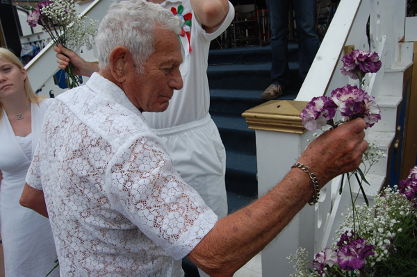 A man takes a carnation from the St. Peter statue at the end of the Fiesta procession.