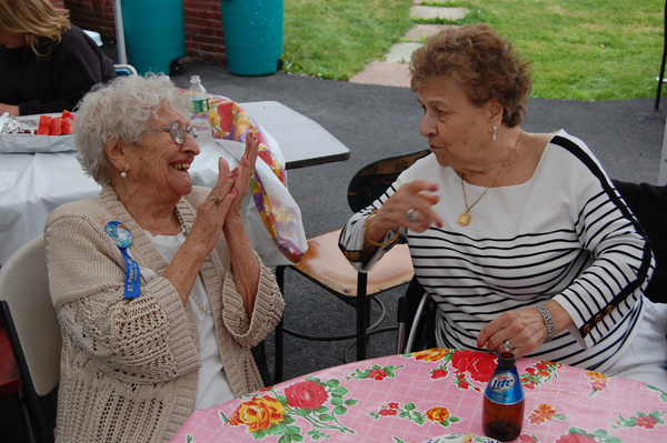Nina Conti (right) and a friend chat during her Fiesta party at her Western Avenue home.