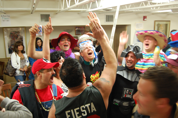 Walkers shout blessings at the St. Peter's Club before Sunday's Greasy Pole contest.