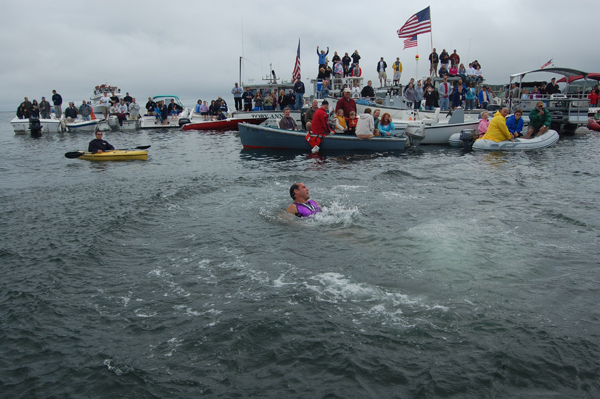 Saturday 2009 Greasy Pole champ Joe "Rocky" Stelline dives into the waters between the Greasy Pole platform and the flotilla of party boats before Sunday's contest.