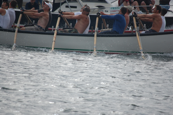 The "Kaos" crew rows to victory in Sunday's men's senior seine boat race.