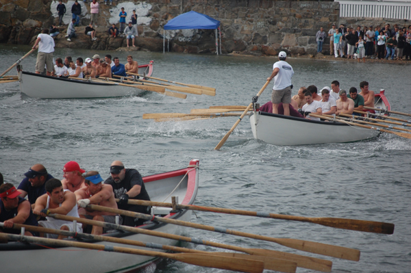 The "Kaos" crew (at top left) rows to victory in the extremely close men's senior seine boat race.