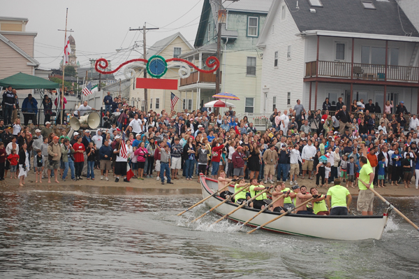 The "Relentless" crew rows to Pavillion Beach and victory in the extremely close men's junior seine boat race.